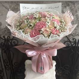 Price: $69.00 Baby pink Roses With Baby Breath In Design Paper Product Tags: Best seller Next-day Delivery