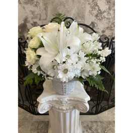 Price: $59.00 White handled basket w all white flwrs lilies alstro daisies Product Tags: Next-day Delivery